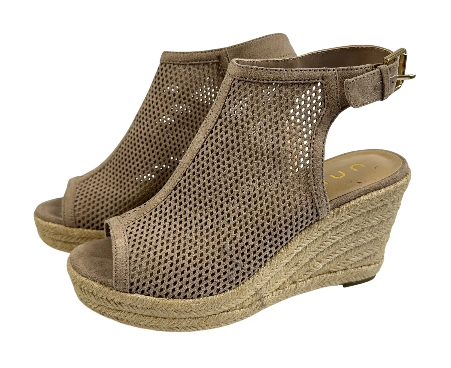 Step into summer style with these chic espadrille wedge sandals. The airy design features a peep toe and a stylish ankle strap with a buckle closure, offering both comfort and a secure fit. A breathable, mesh-like upper adds a touch of modern flair, while the classic espadrille wedge provides a subtle lift. Perfect for a brunch date, a casual evening out, or strolling along the boardwalk. Gently used. Comes in an original box. Style: Espadrille Department: Women Upper Material: Synthetic Heel Style: Wedge Features: Ankle Strap, Breathable, Buckle, Adjustable, Cushioned Closure: Buckle Pattern: Solid Heel Height: Mid (2-2.9 in) Type: Sandal Keywords: UNISA, espadrille wedge, sandals, ankle strap, peep toe, taupe, beige, summer shoes, casual heels, wedge heels, womens shoes, size 6.5, mesh upper, vacation shoes, resort wear