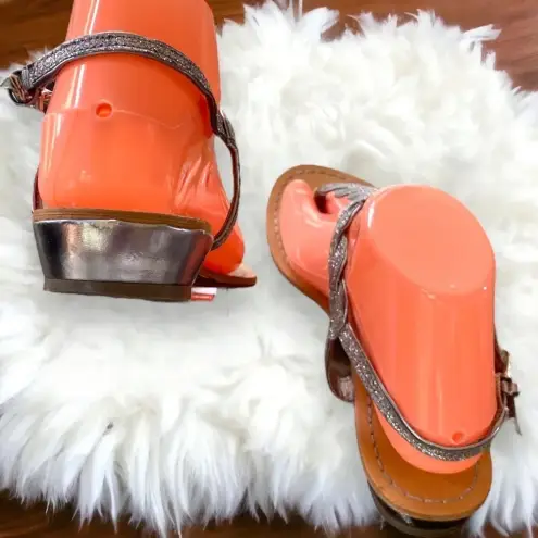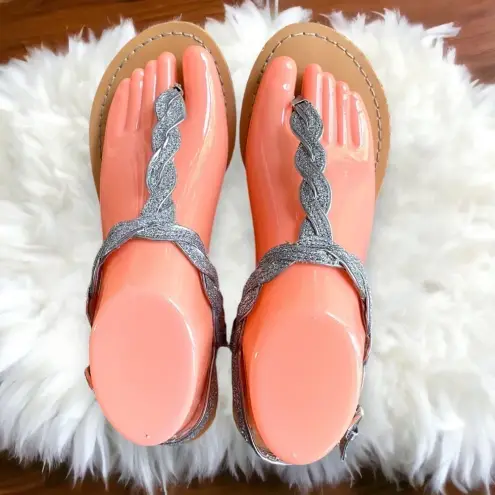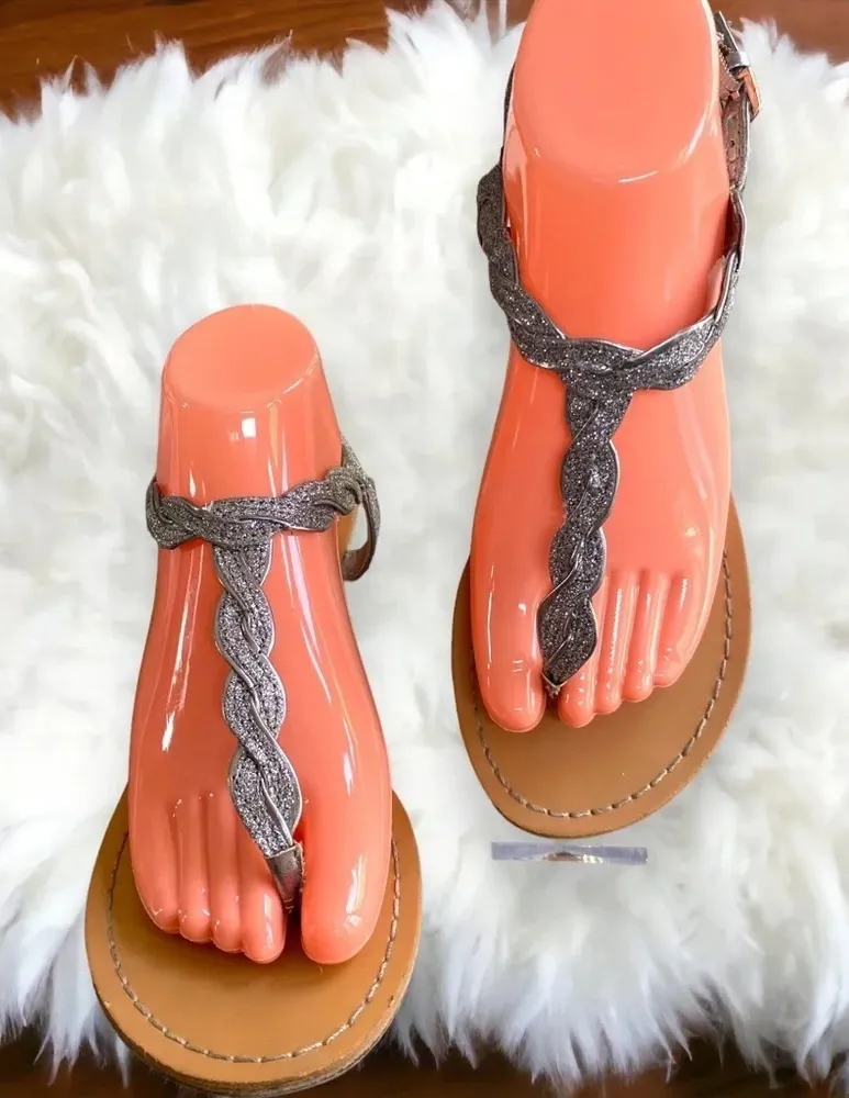 Sparkle and shine with these stylish thong sandals. A braided, shimmering silver strap adds a touch of elegance and secures around the ankle with a delicate buckle for a custom fit. The flat, comfortable sole makes them perfect for all-day wear, whether you're strolling through the city or enjoying a relaxed brunch with friends. These sandals will elevate your everyday style and are perfect for beach vacations, summer parties, or dressing up a casual outfit. Keywords: thong sandals, silver sandals, braided strap, ankle buckle, womens sandals, summer sandals, flat sandals, casual sandals, comfort sandals, dress sandals, beach sandals, vacation sandals, metallic sandals
