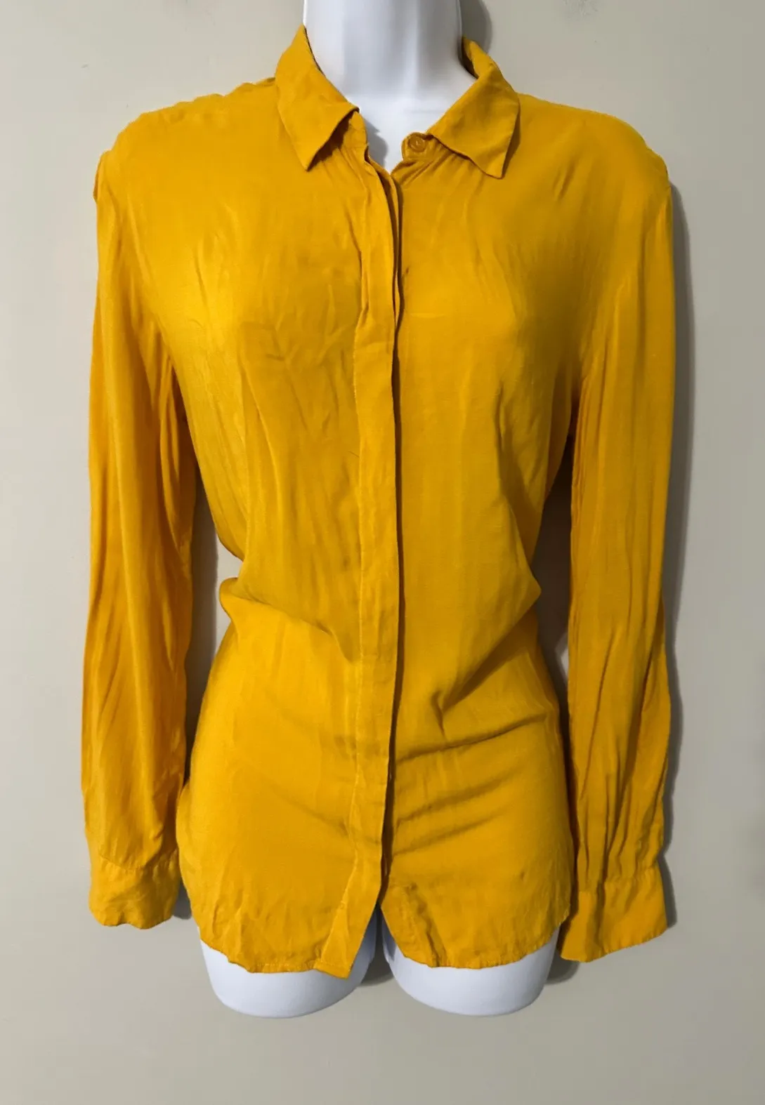 Measurements: Pit to pit 20 Length 26 A vibrant mustard yellow button-up shirt by United Colors of Benetton. This classic collared style features long sleeves with button cuffs and a full button-front closure. The relaxed yet polished silhouette makes it perfect for layering or wearing on its own. Ideal for casual outings, office wear, or a stylish brunch. Type: Blouse Department: Women Style: Basic Material: Viscose Neckline: Collared Sleeve Length: Long Sleeve Sleeve Type: Classic/Fitted Sleeve Pattern: Solid Accents: Button Features: Breathable Fit: Classic Fabric Type: Rayon Occasion: Casual, Business, Workwear Closure: Button Season: Spring, Summer, Fall Keywords: Benetton, button down, collared shirt, long sleeve, mustard, yellow, casual, workwear, smart casual, versatile, basic, minimalist, chic, preppy All items stored in polybags i ship within 2business days