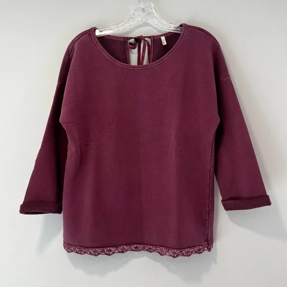 B R A N D: United Colors of Benetton D E T A I L S: Burgundy, Maroon 3/4 sleeve sweatshirt Lace trim bottom Tie back keyhole detail on back C O N D I T I O N: Like-new S I Z E: M E A S U R E M E N T S: (Flat laying and approximate) Underarm to underarm 21 Shoulder to bottom hem length 24.5" Sleeve length 14" M A T E R I A L: 100% Cotton C A R E: Machine washable S T Y L E: Casual Boho Hygge Comfort Athleisure