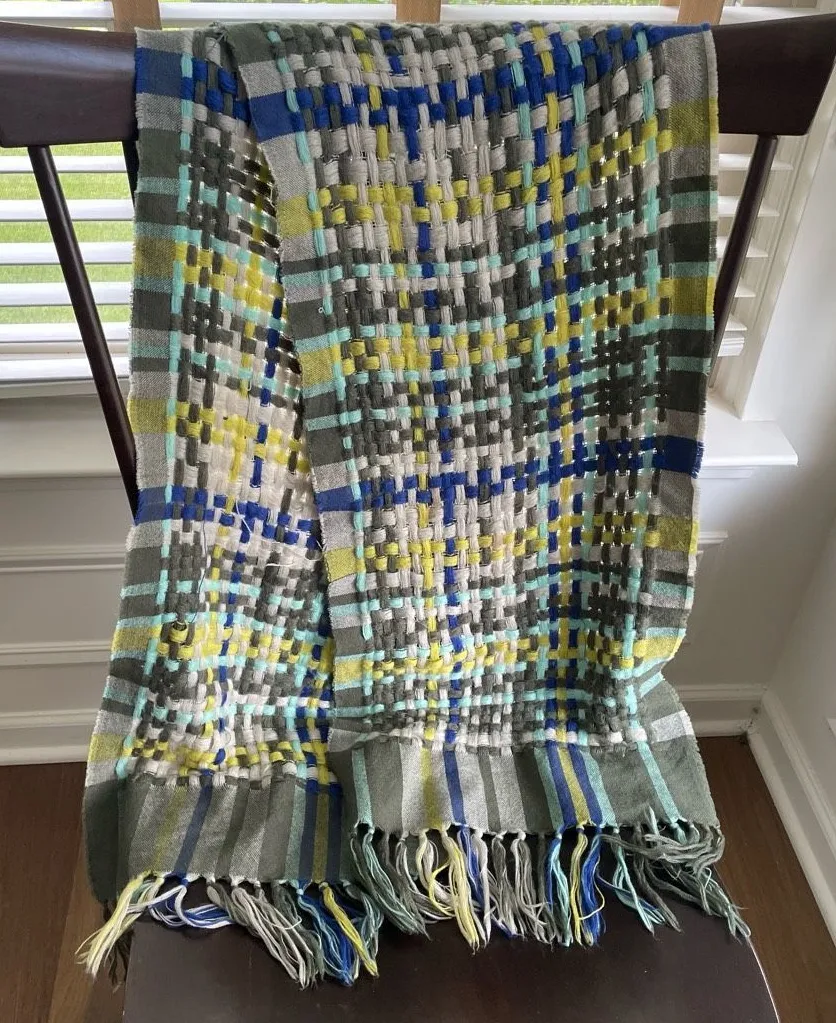 Stile Benetton large basket, weave scarf with fringe on each end. A large, loose, weave in cobalt, blue, olive green, yellow, and white. The style is unisex. Lay flat measures approximately 13 inches wide and 67 inches long with an additional 4 inches at each end of fringe. Some loose threads typical of loose weave.