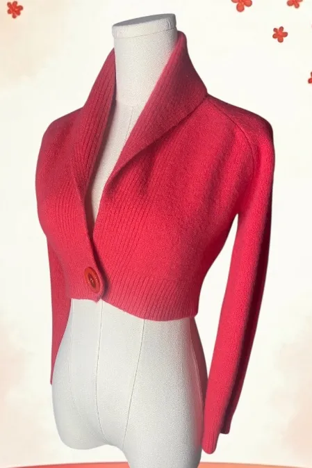 Vintage Made in Italy Benetton 100% Pure New Wool Cropped Bolero Cardigan This stunning vintage piece from Benetton is a fabulous, vibrant addition any wardrobe. Made in Italy, this cropped cardigan, often called a bolero, features a beautiful coral/bright pink hue and is crafted from luxurious 100% Pure New Wool (as confirmed by the Woolmark tag). Key Features: • Fabric: Soft, high-quality knit made of Pure New Wool. It's cozy yet lightweight. • Style: Very cropped fit that hits high on the waist, perfect for layering over dresses, tops, or high-waisted bottoms. • Collar: Features an elegant shawl collar or wide lapel. • Closure: Secured with a single, large, translucent orange/coral button. • Era: Likely vintage based on the "Made in Italy by Benetton" tag style. • Condition: Excellent vintage condition. A chic, warm, and playful piece that embodies vintage Italian knitwear and Benetton's iconic style. Please check all photos and note the care instructions (visible on the reverse of the tag Hand wash) measurements Length 14” Bust 17”. Sleeves 23” • Brand & Origin: Benetton, United Colors of Benetton, Made in Italy, Italian Knitwear, Woolmark, Vintage • Material: Wool, Pure New Wool, Pura Lana Vergine, Knit, Knitwear, Sweater, Jumper •Note no size tag according with measurements fits XS/S