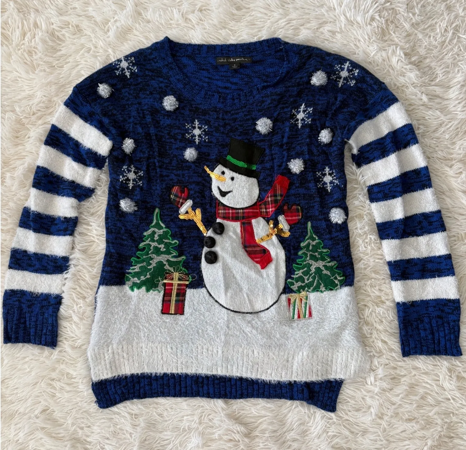 Spread holiday cheer with this festive Christmas sweater! A playful snowman appliqué takes center stage, complete with a jaunty plaid scarf, cheerful mittens, and golden twig arms. Embroidered snowflakes and fluffy snowballs dance around the snowman, creating a whimsical winter scene. Fluffy white material forms the "snow" at the bottom. Horizontal white stripes accent the blue background on the sleeves. Wear this unique sweater to your next holiday party, a cozy family gathering, or even while decorating the Christmas tree. Measurements: • Pit to pit: 19 inches • Length: 24 inches Echristmas Style: Pullover Color: Blue Department: Women Type: Sweater Material: Acrylic, Wool Blend Sleeve Length: Long Sleeve Neckline: Round Neck Features: Embroidered, Applique, Novelty, Christmas Theme Pattern: Striped Fabric Type: Knit Accents: Embroidered, Applique, Button Character: Snowman Keywords: Christmas sweater, ugly Christmas sweater, snowman sweater, holiday sweater, blue sweater, striped sweater, winter sweater, festive sweater, novelty sweater, embroidered sweater, applique sweater, small sweater, women's sweater, Christmas, Holidays
