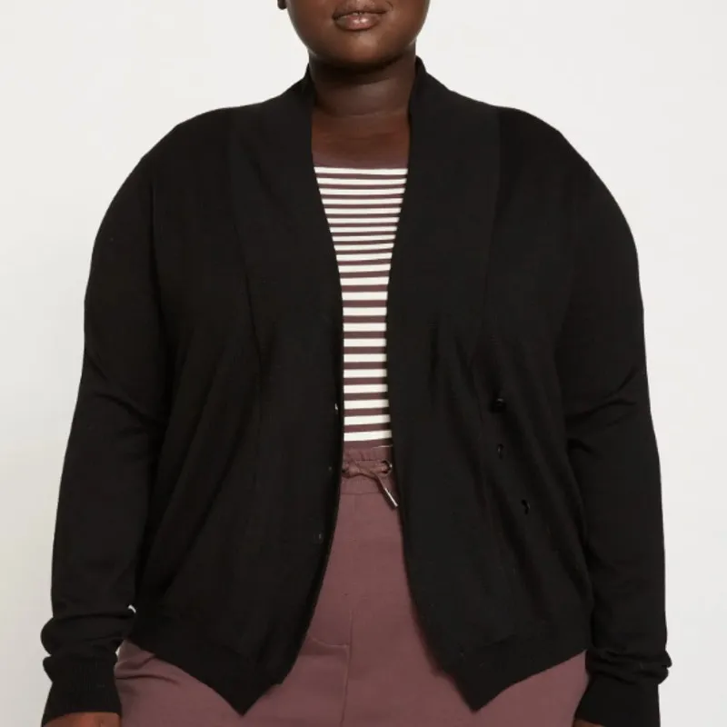Universal Standard XS = US M/L (10-12) Excellent, pre-owned condition. No flaws. Curved-front cardigan Solid black color Long sleeves Three button closure on front 100% Italian merino wool Wear it over tops and tees as a light layer RETAIL $168 Bust: 18" Length: 22-25" Not sure if it will fit? Measure 1 or 2 of your favorite clothing items and compare. Measurements are approximate flat-lay.