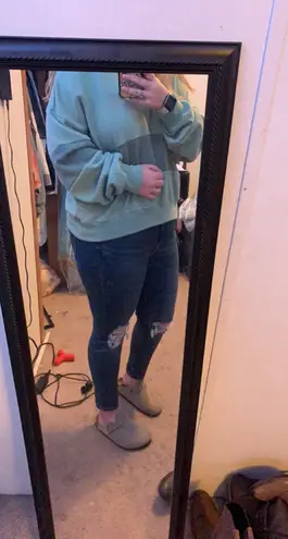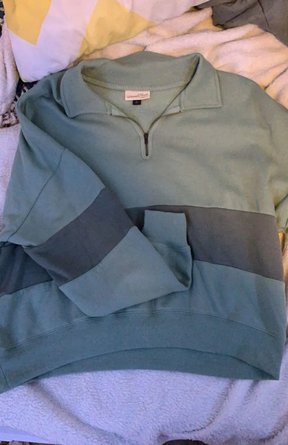 Super cute 1/4 zip sweatshirt with darker green stripe around the middle. It is semi cropped, it doe... Show more