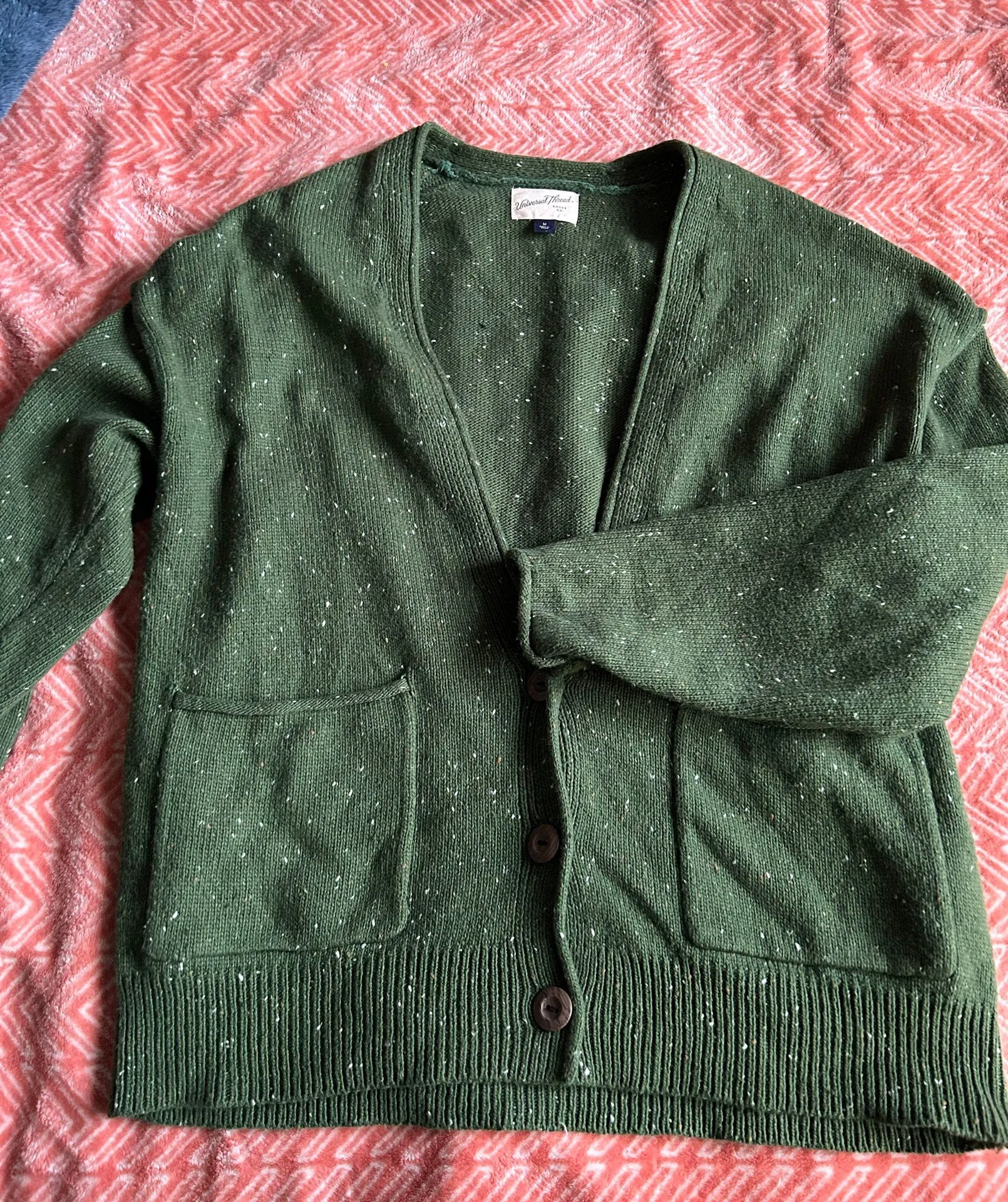 -green with white speckles cardigan -size medium -3 buttons at bottom -new without tags, never worn