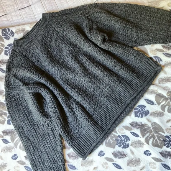 black or dark grey knitted sweater, long sleeves, crewneck, keeps you warm, tag has been cut off