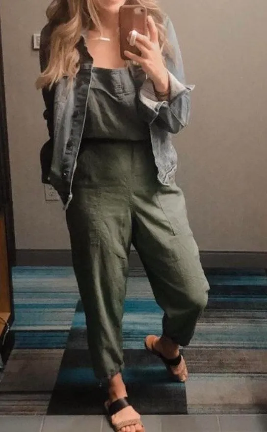 Only worn once, no flaws, perfect condition. Linen blend Universal Thread olive green overalls. Belt included but can be worn without. Very cute and flattering on, can easily be dressed up or down. The stock photos look more mint green but it’s an olive green, almost army green. Inseam is 25” Quick shipping
