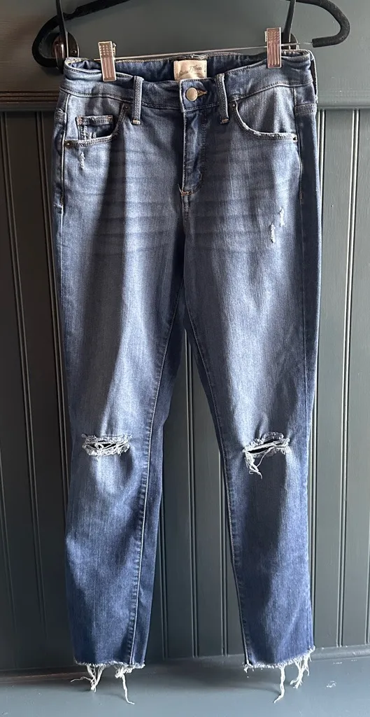 Stylish dark blue jeans with distressed details. Ankle length for a modern look. Perfect for casual... Show more
