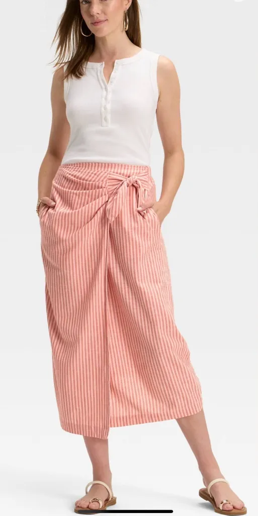 Chic pink striped midi skirt. Features a tie waist. Perfect for casual outings.