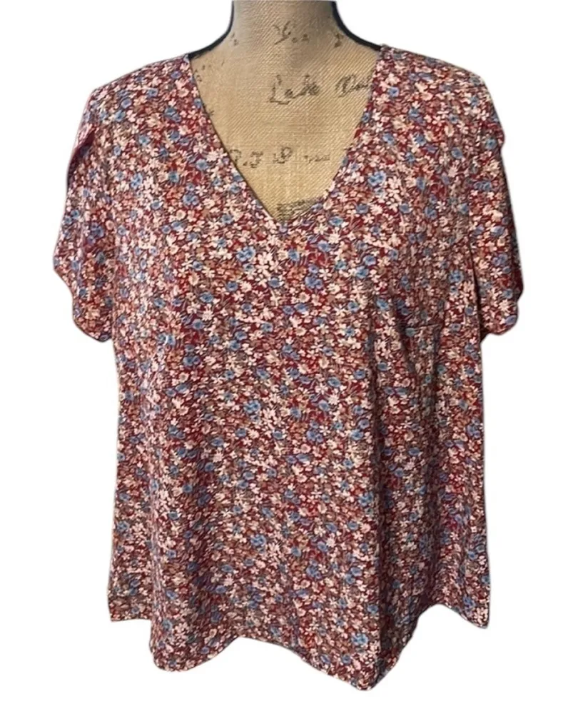 Red v-neck blouse with blue, whit and tan florals. Tag has been partially cut out, please see photos. Unknown brand, unknown exact size. fits like a 1X but may also work for XL. P2P - 22.5"; Shoulder to hem length - 25"