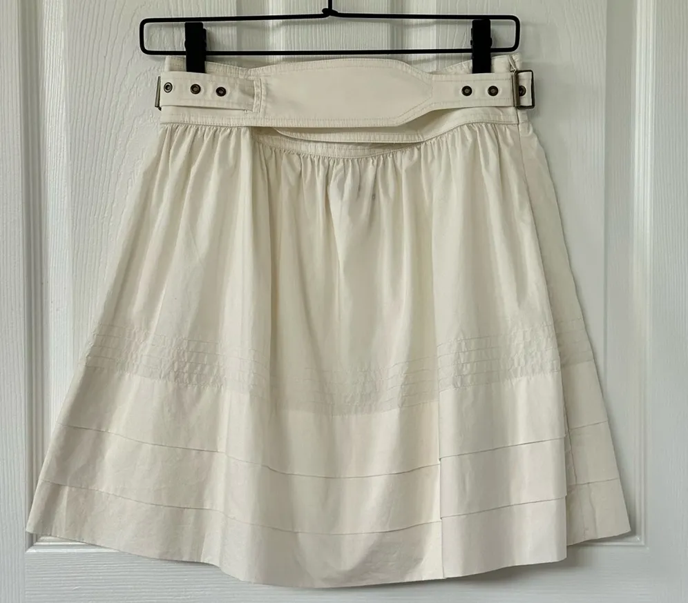 Size 6 Condition: Very Good! Subtle stains (shown in photos) that I believe would come out when washed. This cream mini skirt features a playful style with a pleated A-line silhouette, perfect for casual or resort wear. Its lightweight fabric and high waistband offer a comfortable fit, making it a versatile addition to your wardrobe. It has a unique and stylish belt attached.