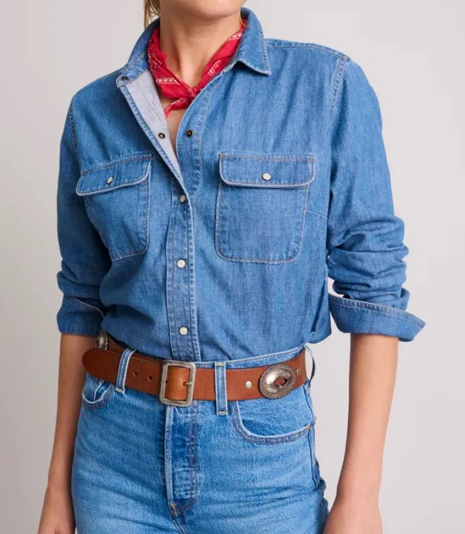 Untuckit for Her Serena Shirt Denim Cotton Western Long Sleeve Pearl Snap Size 6 Excellent condition Approximate measurements: Length: 25” Bust: 42” We used the timeless look and feel of your favorite lived-in jeans as inspiration for this essential denim shirt. It's the laid-back workshirt-inspired style everyone needs in their closet. Its 100% cotton fabric, perfect length, and no-gap Perfect Placement Buttons are sure to make it the most adaptable style in your rotation.
