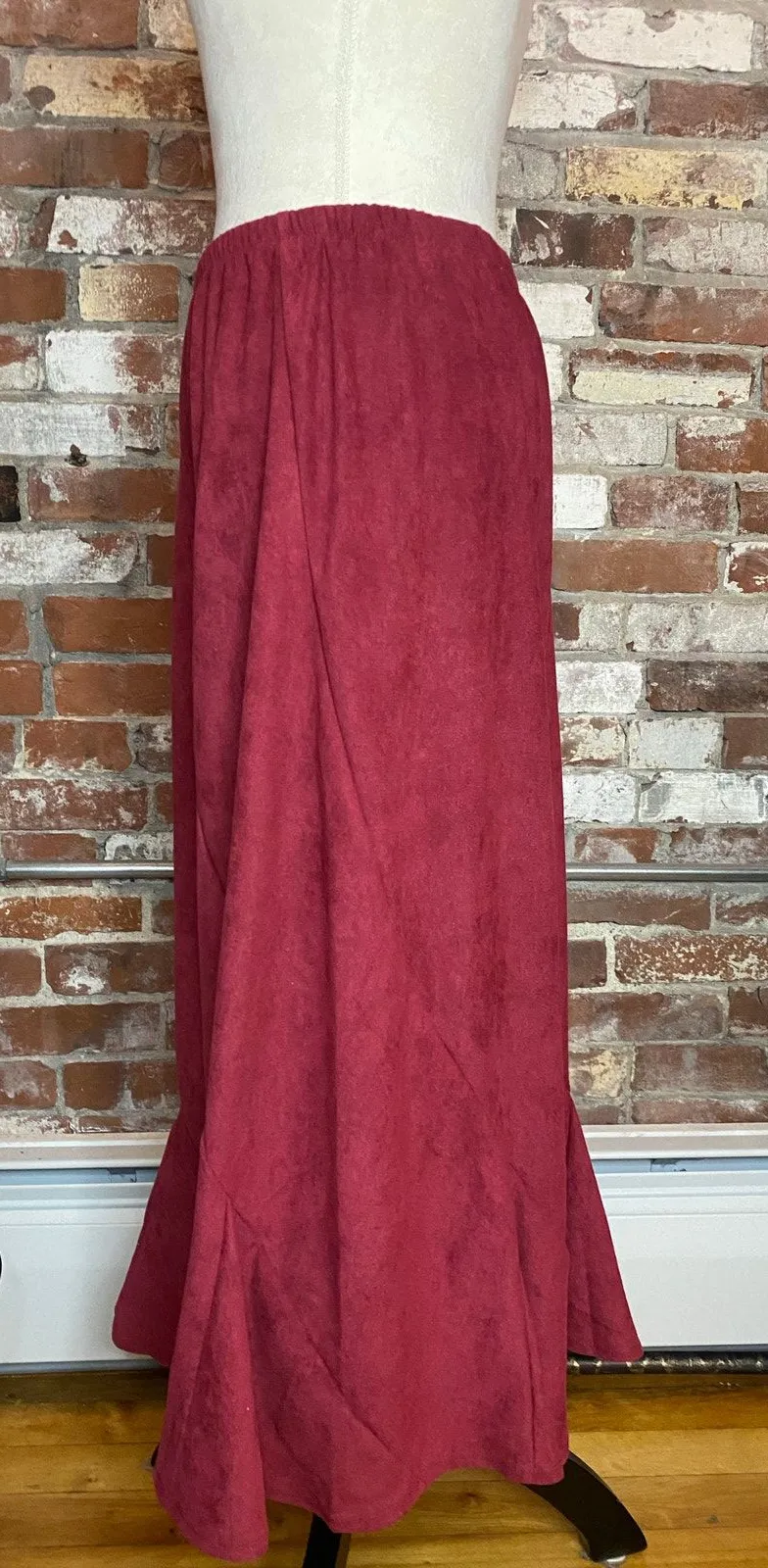 Elevate your wardrobe with this stunning burgundy faux suede maxi skirt. Perfect for adding a touch of boho chic or western flair to any outfit. The A-line silhouette flatters all body types, while the rich wine red color exudes sophistication. This skirt is brand new with tags and ready to wear. It's a size M and crafted from high-quality faux suede, offering a luxurious look and feel. Pair it with your favorite boots and a cozy sweater for a stylish fall or winter look, or dress it up with a blouse and heels for a night out. Don't miss out on this versatile and fashionable piece!