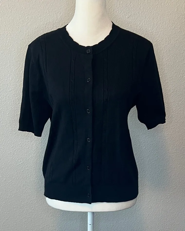 Size medium Viscose/cotton Hip length lightweight cardigan Scalloping at neck Good used condition. No stains or flaws Approx measurements lying flat: 17” pit to pit 21.5” length 1824