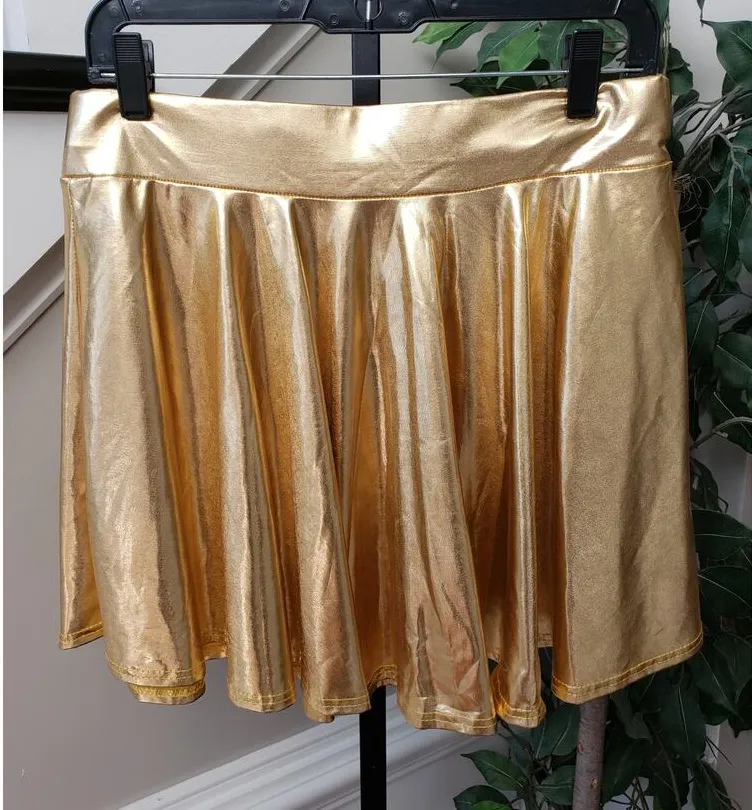 Shine bright with this Urban Coco gold metallic skater skirt in size XL. Made with a stretchy polyester-spandex blend, it features a dazzling reflective finish and flared silhouette—perfect for parties, cosplay, performances, or festival wear. Comfortable and bold, this skirt adds sparkle to any outfit and moves beautifully with every step. Brand new with tags. Key Features : Brand: Urban Coco Size: XL Color: Gold metallic Style: Skater / Circle skirt Material: 95% Polyester, 5% Spandex