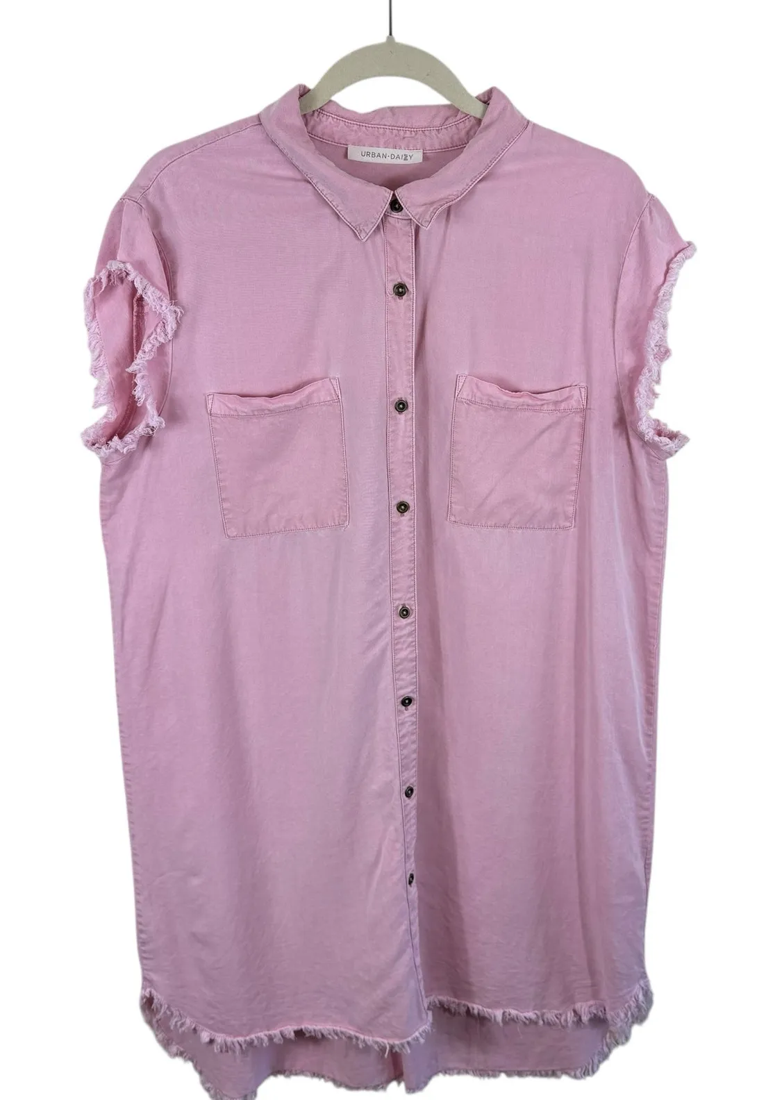 Excellent preowned condition. Urban Daizy Pink Tencel Raw Hem Cap Sleeve Collared Button Up Shirt Dr... Show more