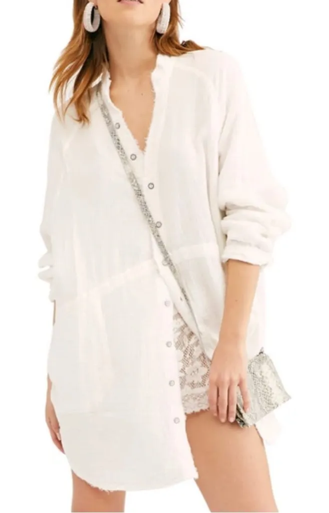 Full of everyday ease, this breezy cotton tunic shirt is styled with a dipped neckline and lived-in frayed edges. Relaxed Fit. In very good condition. Little to no signs of use. No wear. No rips,tears,holes, or stains. Color: Cream ( Neutral / Natural ) Size: M Approx: Unstretched Laying Flat- Armpit to Armpit 22.5” Shoulder to Bottom Hem 33” Beach. Lounge. Boho. Bohemian. Relaxed. Cruise wear. Resort wear. Coverup. Capsule wardrobe. 8
