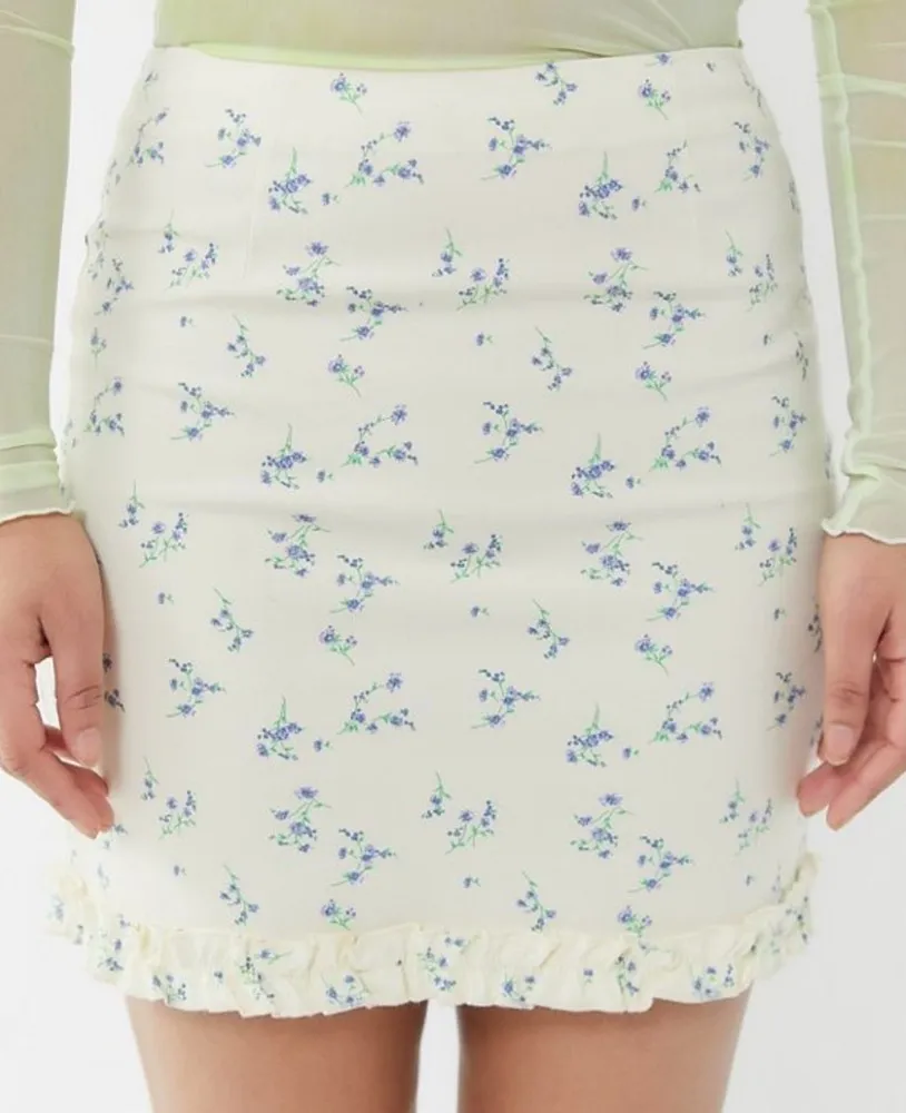 Urban Outfitters Ashton Ruffle Mini Skirt Pale Yellow with Blue Flowers. Pale yellow with small blue... Show more