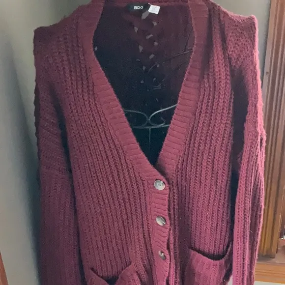 Dark red knit cardigan sweater with buttons and pockets. Urban Outfitters BDG brand, size L. 100% ac... Show more