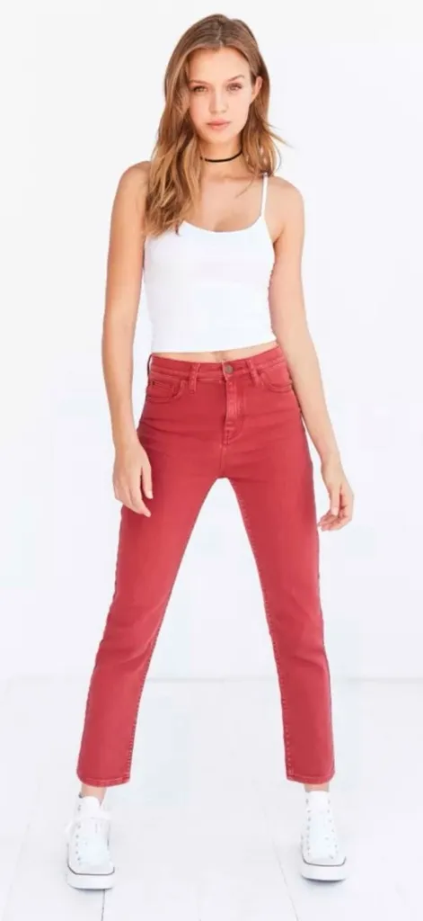 UO's exclusive girlfriend jean in tonal color pop denim by BDG. It has a muted red color with a gene... Show more