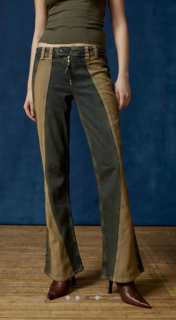 . Low rise that sits at the hip. Flare leg silhouette. Full length that hits below the ankle. Butto... Show more