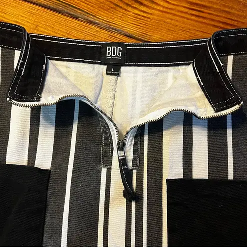 Urban Outfitters BDG black and white striped denim mini skirt with a bold Y2K grunge aesthetic. Features a front zip closure, pockets, structured denim, and high-contrast vertical stripes that create an edgy, statement look. Perfect for festival outfits, grunge streetwear, night out styling, or pairing with crop tops, corsets, baby tees, platform boots, or sneakers.