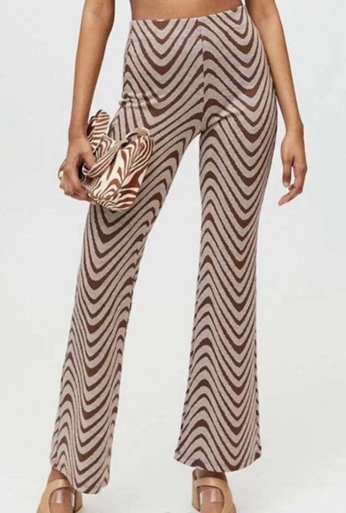 Embrace a groovy retro vibe with these eye-catching Urban Outfitters flare pants. The bold wavy prin... Show more