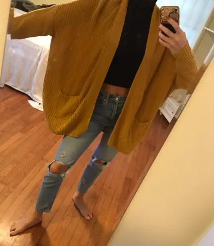 Knit Mustard yellow cardigan. Oversized but is a size s/m. Lightly worn. Tag cut out for comfort.