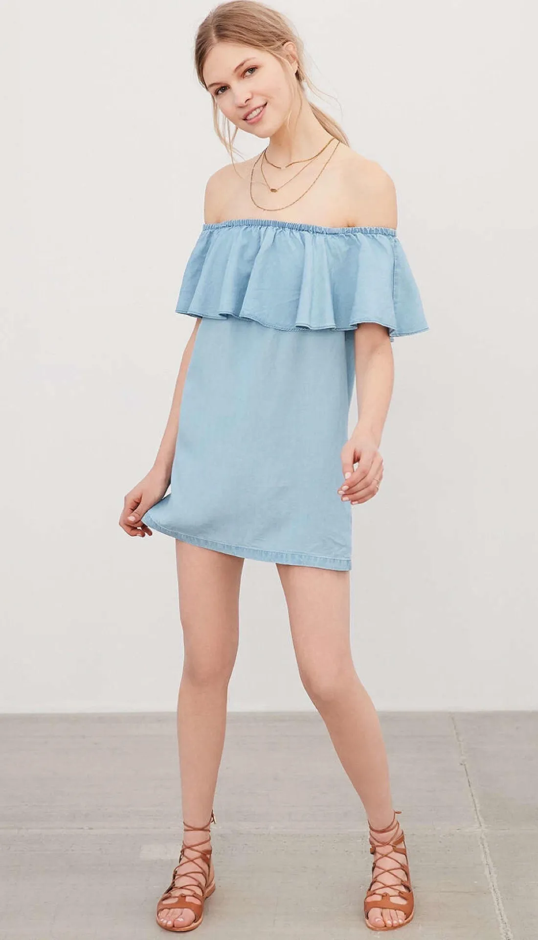 Urban Outfitters Cooperative Blue Penny Chambray Off-the-Shoulder Mini Dress, size XS. Vintage light... Show more