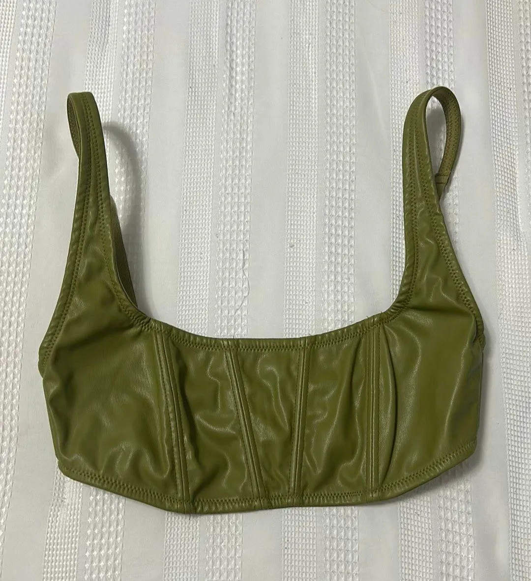 This is a green corset bra from Urban Outfitters. It fits to size and is comfortable. It is a leathe... Show more