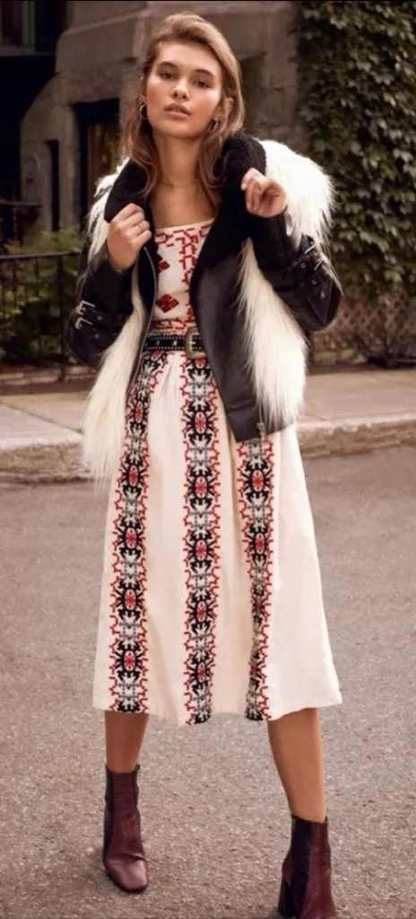Chic cream midi dress with bold black embroidery. Stylish and versatile for any event. Smocked back... Show more