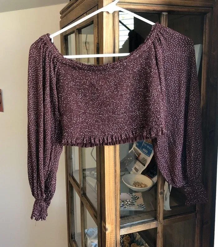 It’s a maroon off the shoulder top with flowy sleeves and white polka dots! Barely worn!