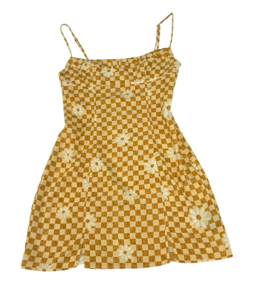 This is a retro inspired checkerboard mini dress featuring a warm mustard and cream grid pattern wit... Show more