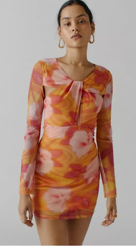 Urban Outfitters mini dress in orange & pink Sheer long sleeve , crisscross front with cut out on s... Show more