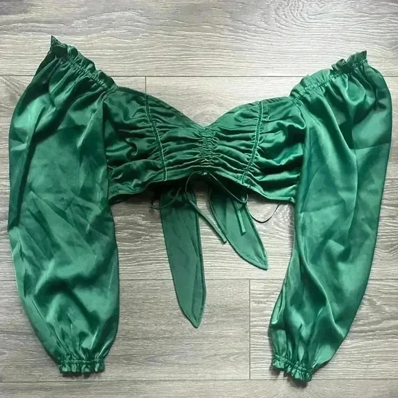 Urban Outfitters crop top. Tie back. Ruched front details. Satin feel. Velvet accent piping. Front b... Show more