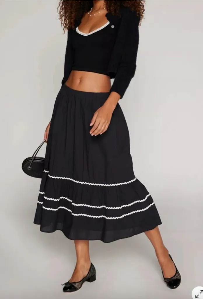 . Black midi tiered skirt with white ric rac trim. elastic waist. waist is 13" across, length 32"