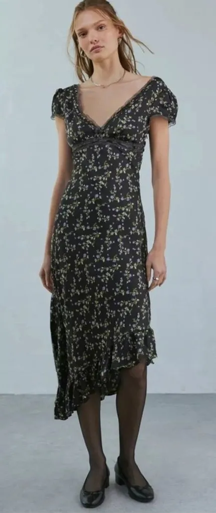 Urban Outfitters Kimchi Blue Cora Asymmetrical Floral Midi Dress Size Medium Lace trim, bow detail,... Show more