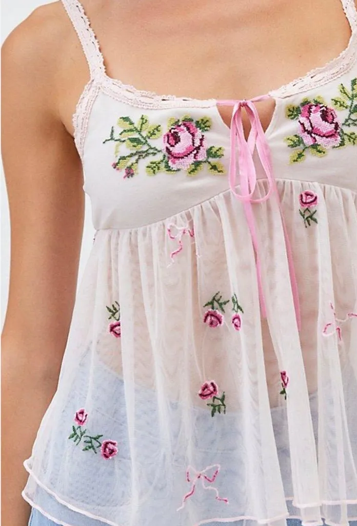 • Super feminine and trendy babydoll top in white with pink embroidered roses and bows • Lace and m... Show more
