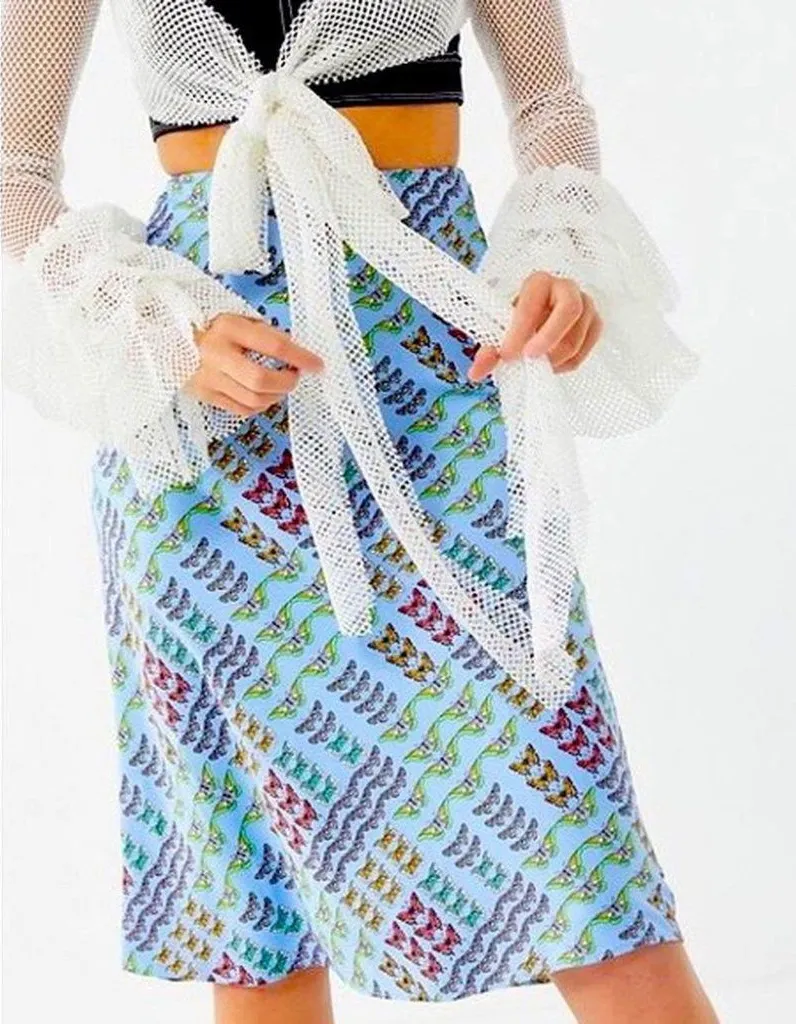 . Light blue satin midi length skirt with multicolored butterflies allover the skirt. side zipper. t... Show more