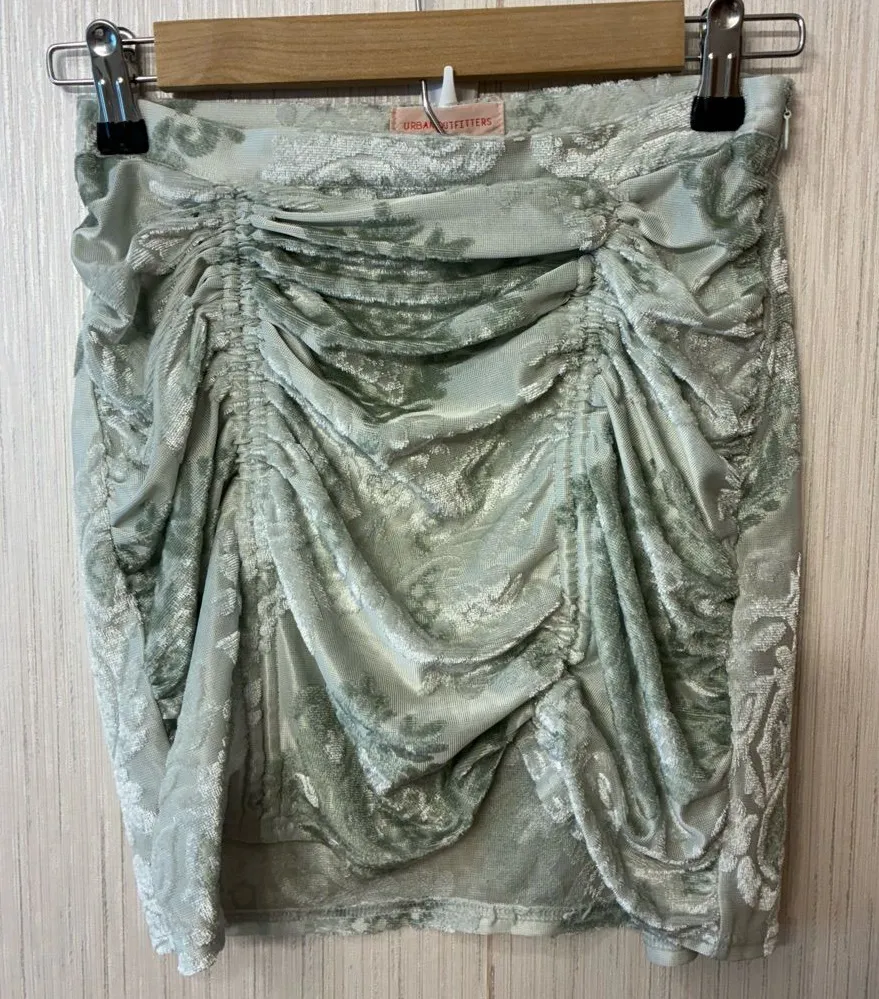 Urban Outfitters Light Green Burnout Velvet Jacquard Ruched Mini Skirt length 16in waist 12.5in