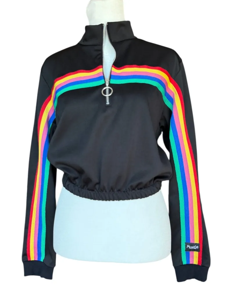 Minga London Rainbow Striped Crop 1/4 Zip Black Top Sz S Elastic at waist Poly/Elastane Approximat... Show more