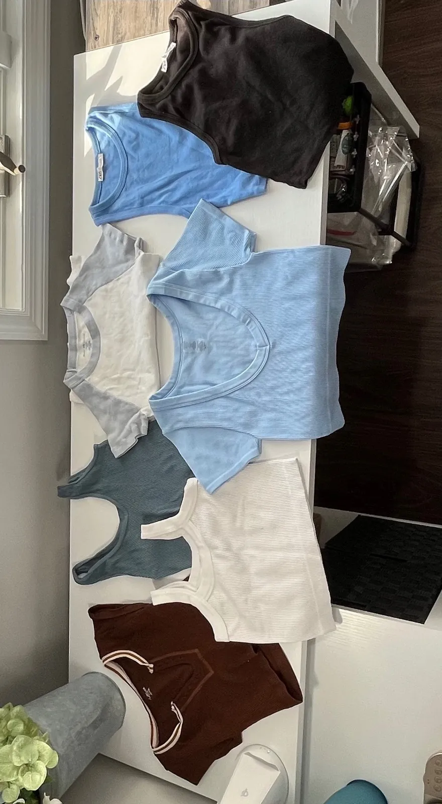 Bundle of seven ribbed tank tops and tees from Urban Outfitters including Out From Under and Love Poem brands. Also included Brandy Melville, Zara and Suzette. 1 brown short sleeve top with striped collar 1 white ribbed tank with rounded neckline 1 light blue ribbed short sleeve tee with v-neck 1 grey and white raglan short sleeve tee 1 blue ribbed tank with wide straps 1 black ribbed tank and 1 light blue ribbed tank. All items are size S or M Preloved excellent condition. Keywords: ribbed tanks, basic tops, summer tops, layering tops, casual wear, everyday style, athleisure, loungewear, knit tops, cropped tanks, scoop neck, v-neck tee, m l size Smoke free dog loving home