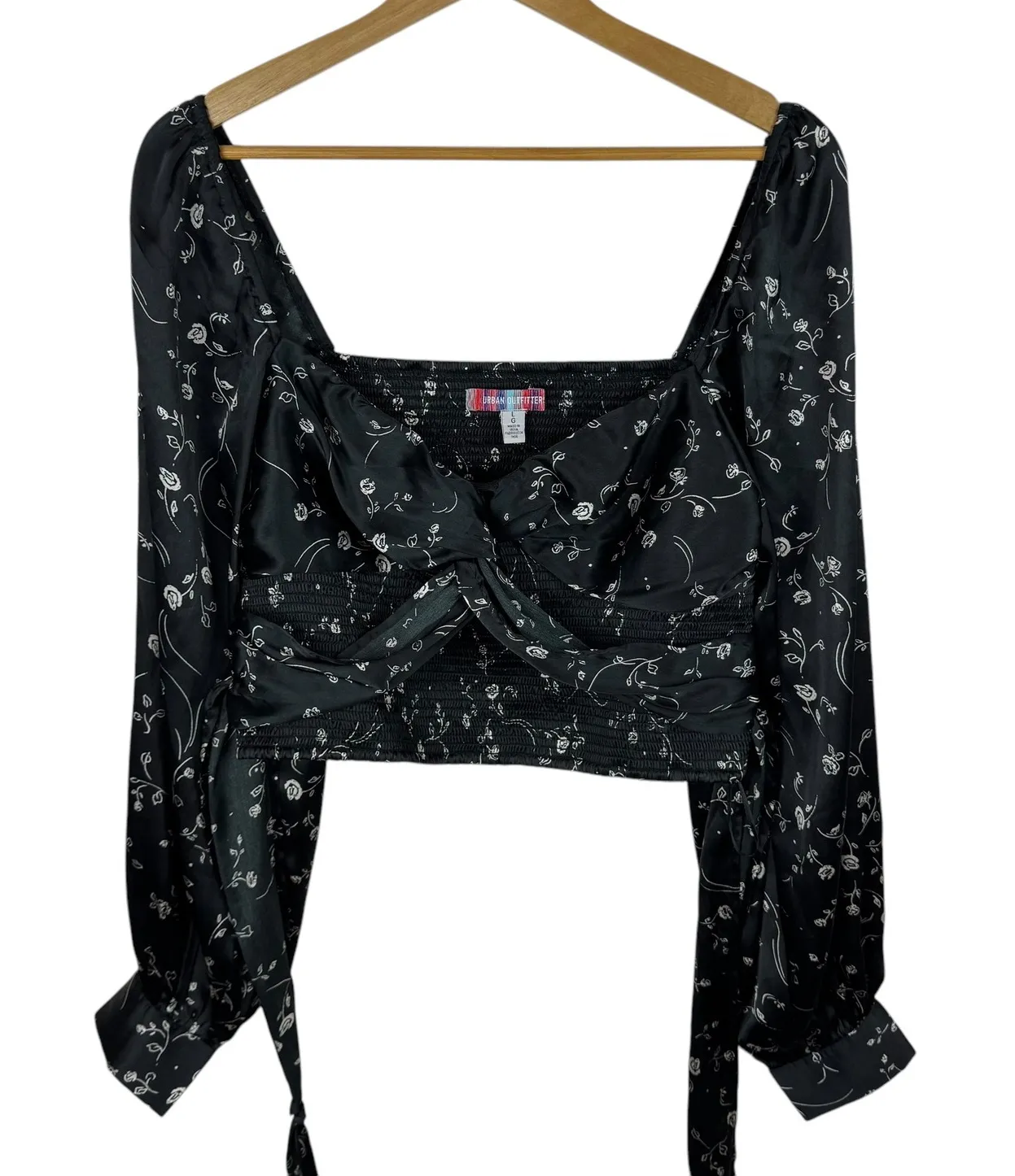 Keywords: floral blouse, long sleeve top, tie front blouse, black floral top, square neck blouse, urban outfitters top, satin blouse, womens blouse, party top, going out top, blouse, floral, long sleeve, tie front, black