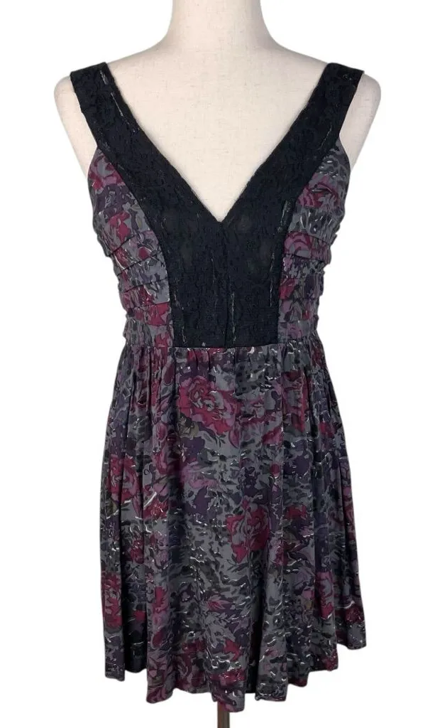 Urban Outfitters UO Staring at Stars Floral Mini Dress Gray and purple floral print with black lac... Show more