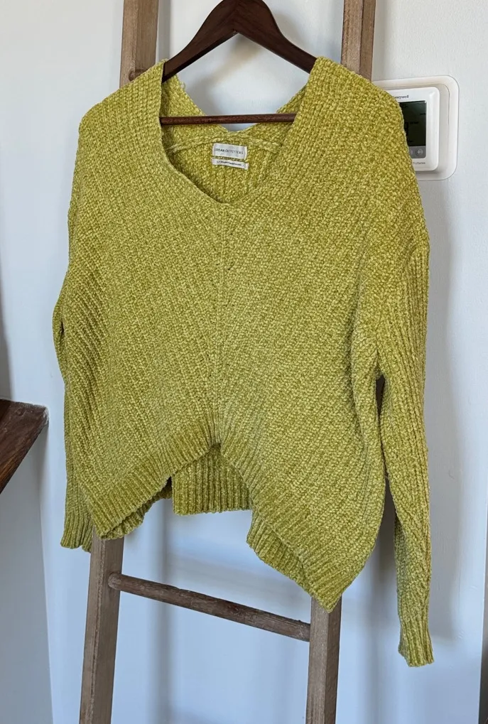 Textured knit sweater with a V-neck. Bright yellow hue. Chunky cropped sweater