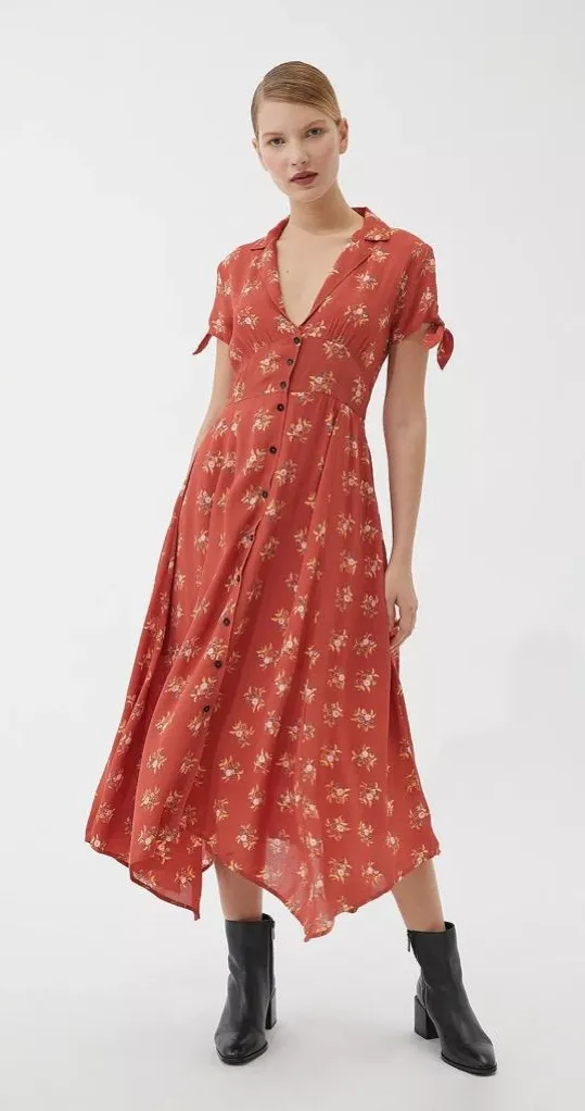Featuring a vibrant red floral print, a flattering button-front design, and Urban Outfitters’ signature soft, flowy fit, this dress can be styled for casual days, date nights, and everything in between.