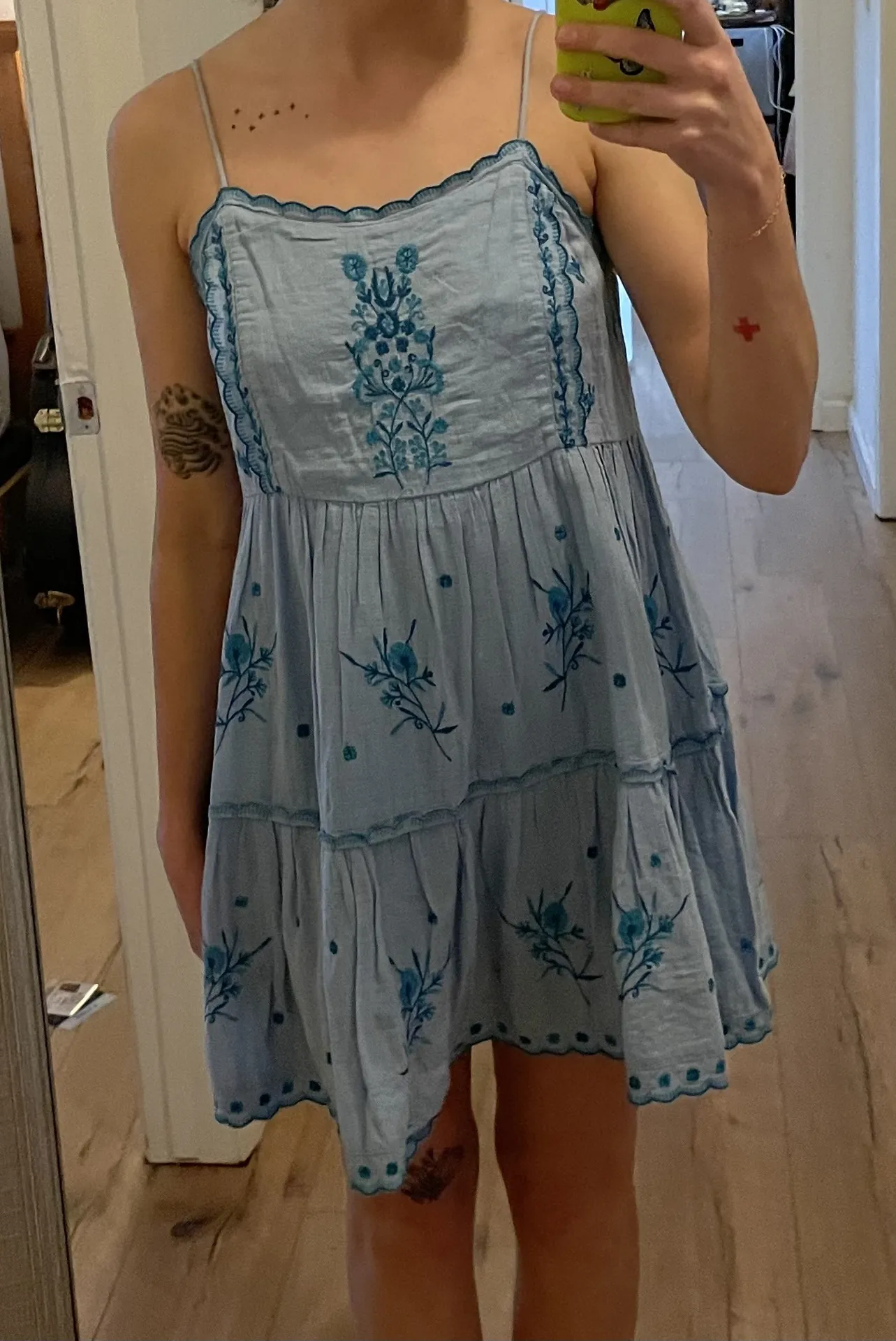 Urban Outfitters UO Hanna Embroidered Scalloped Babydoll Mini Dress in a cornflower blue color with teal floral embroidery size SMALL - $21 - From Madeline