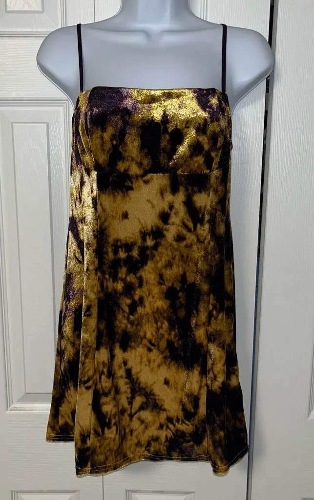 Dark purple and golden yellow dress with tie dye pattern; Adjustable spaghetti straps, a zip up side; horizontal accent tie in the back (could also be worn as a halter strap)