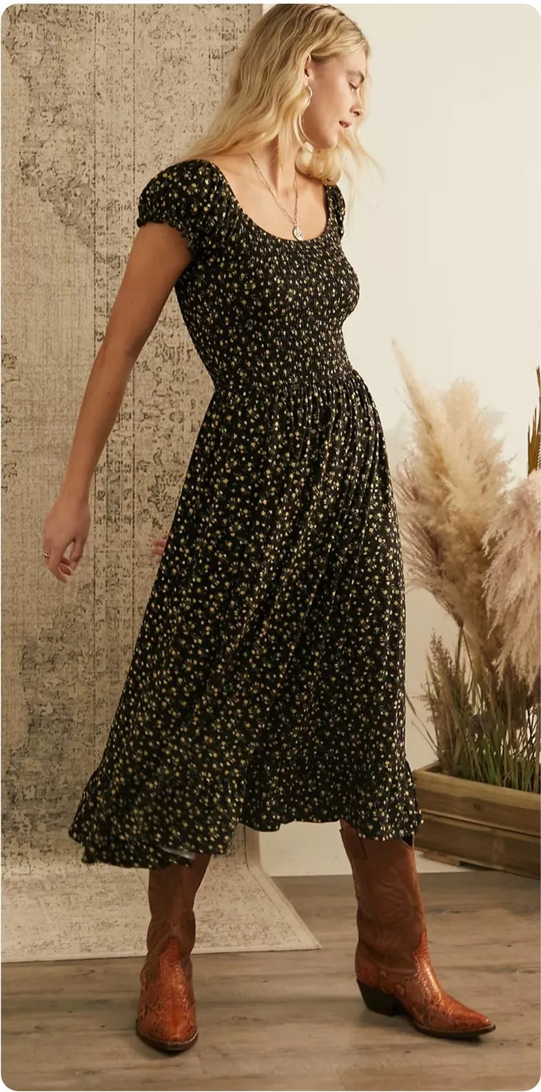 Urban Outfitters Womens Tessie Ditsy Floral Smocked Milkmaid Midi Dress Size Small in Black and Yell... Show more